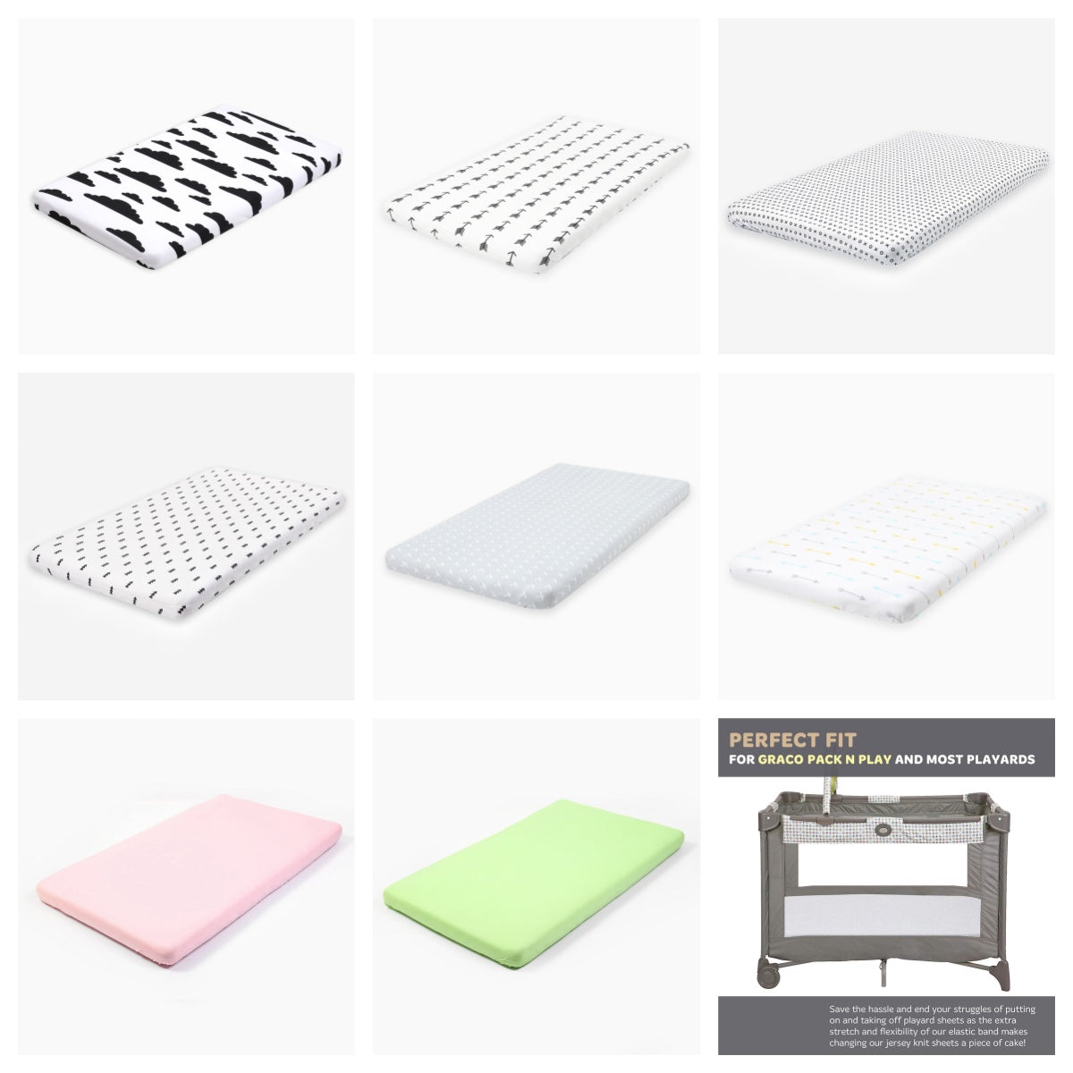 · Soft and Safe: Our pack n play sheets are made of jersey knit cotton for naturally stretchy. Cotton is one of the softest fabrics, which is ideal for babies with sensitive skin. With the safety and soft playard sheets, your baby will have a better sleep